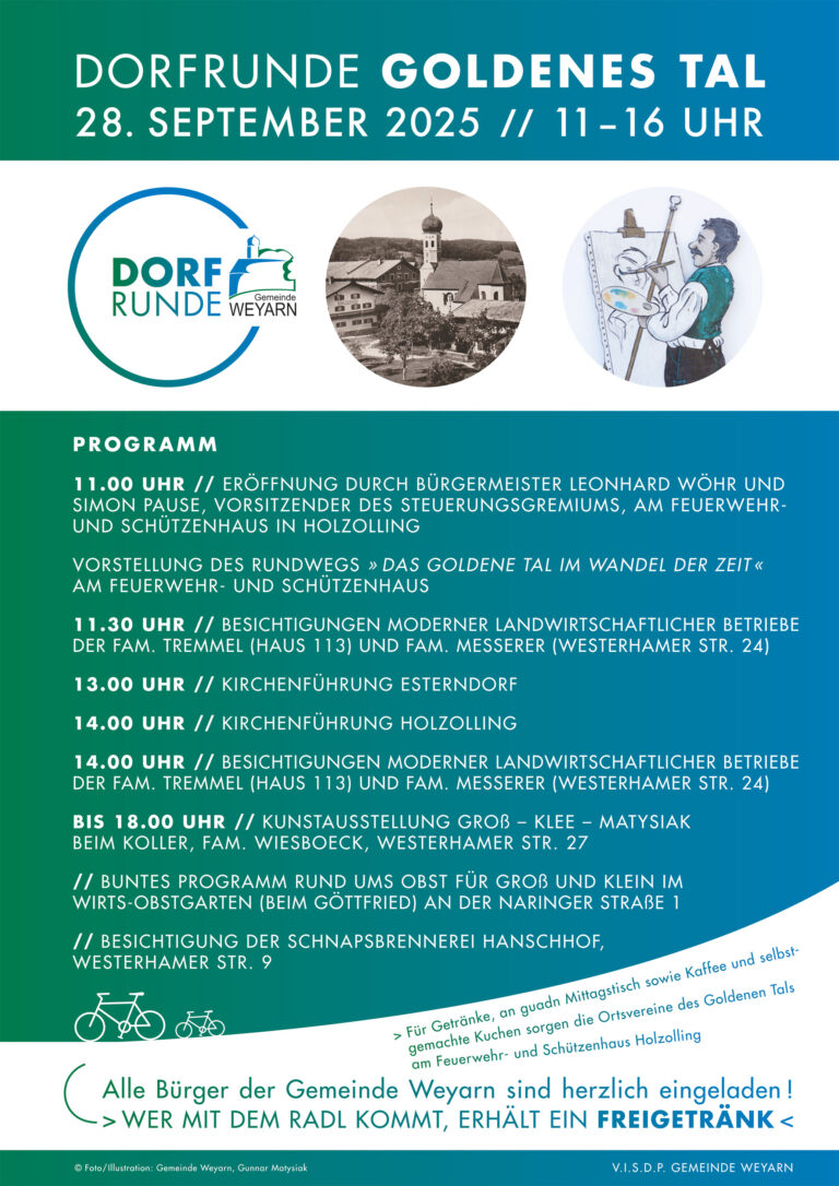 Am Sonntag, den 28. September 2025, findet in der Gemeinde Weyarn die Dorfrunde „Goldenes Tal“ statt. Im Rahmen des vielfältigen Programms gibt es Einblicke in die „Künstlerkolonie Goldenes Tal“ mit Werken von Charlie Groß, Herbert Klee und Gunnar Matysiak im ehemaligen Stall des Koller-Anwesens in Holzolling.