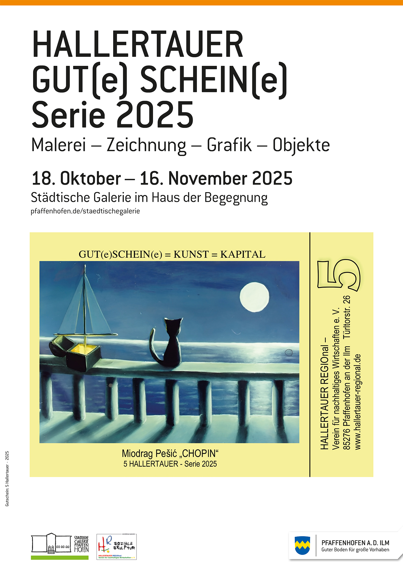 Bereits seit 2004 gibt es die Regionalwährung „Hallertauer“. Zum 21. Mal erscheinen heuer die HALLERTAUER GUT(e)SCHEIN(e), auf denen wie jedes Jahr Abbildungen der Werke von Künstlerinnen und Künstlern mit persönlichem Bezug zu Pfaffenhofen abgebildet sind. Unter dem Titel „Malerei – Zeichnung – Grafik – Objekte“ beteiligen sich acht Künstlerinnen und Künstler aus der Region an der Ausstellung – Sabine Ackstaller mit Figuren, Iryna Fedorenko und Miodrag Pešićaus mit Malerei, Natalie Ponsot mit Malerei bzw. Objekten, Sebastian Schwamm mit Illustrationen bzw. Zeichnungen, Alfred Ullrich mit Druckgrafik, Matthias Wurm mit Objekten und Herbert Klee mit Malerei. Zudem werden die Ersttagsdrucke der Gutscheine in Verbindung mit grundlegenden Informationen zum Gemeinwohlgeld „Hallertauer“ gezeigt.